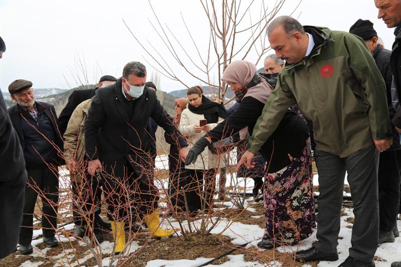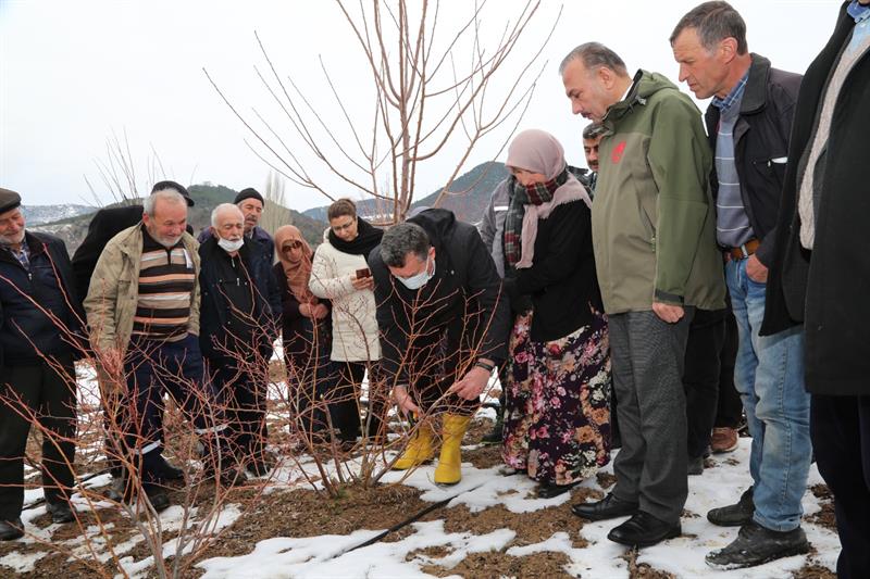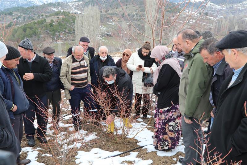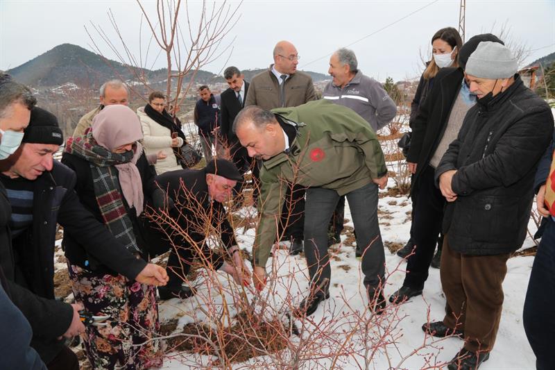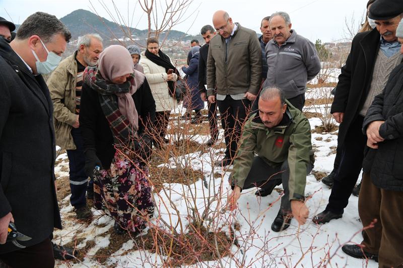 Bursa İl Tarım ve Orman Müdürlüğü Bitkisel Üretim ve Bitki Sağlığı Şubesi teknik personellerinden Ziraat Mühendisi Erdem DURGUT ve Zeynep Tümay AYDIN ÖLMEZ tarafından Köy kahvehanesinde gerçekleştirilen teorik eğitimin ardından Göynükbelen Mahallesindeki Maviyemiş üreticilerinden Ümmügül SEYMEN'in bahçesinde uygulamalı olarak budama eğitimi gerçekleştirildi.