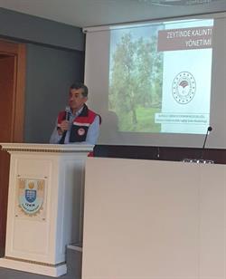 Zeytin üretiminde verim ve kalitenin arttırılması konusunda uygulanacak tedbirler hakkında yapılan toplantıda Ziraat Yüksek Mühendisi Murat Kaplan, Ziraat Mühendisi D. Kaya Şimşek ve Ziraat Yüksek Mühendisi İpek Sezer ise eğitimci olarak yer aldı.