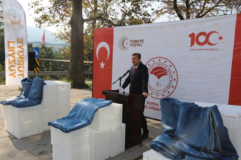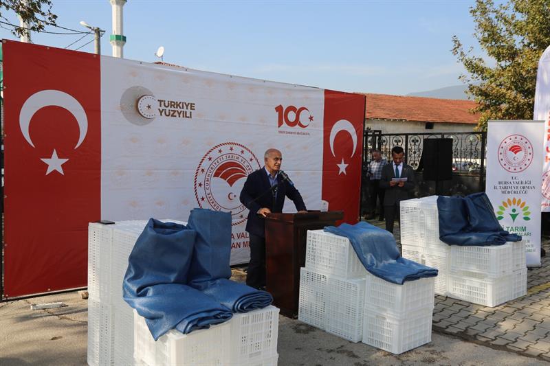Bursa' nın tarımsal anlamda en önemli ürününün zeytin olduğunu dile getiren İl Müdürü şunlara değindi: “ Bursa' da 441 bin dekarlık alanda zeytin üretimi yapıyoruz. İlimizde yetişen ürünler içerisinde hem alan olarak en büyük hem de Bursa'nın tarımsal hasılasına en fazla katkı sağlayan, Bursa'nın tarımsal anlamda ilk sırada yer alan ürünü zeytin. Türkiye' de zeytin denince ilk akla gelen ilçe ise Gemlik. Bugün İyi Tarım Uygulamalarının Yaygınlaştırılması ve Kontrolü Projesi kapsamında çiftçilerimize üretimde kullanmaları için malzeme dağıtımı yapmak için bir araya geldik. Hasat sezonunun çiftçilerimiz hayırlara vesile olmasını temenni ediyorum. Gemlik İlçe Müdürlüğümüze ve emeği geçenlere teşekkür ediyorum."