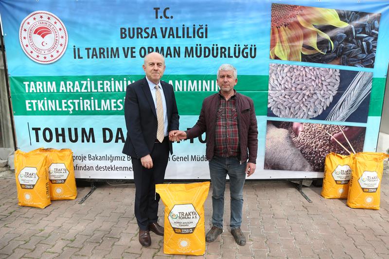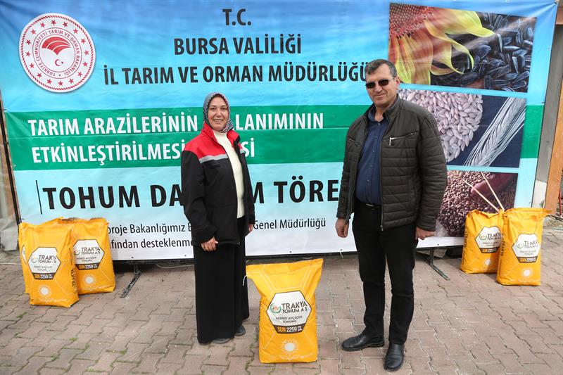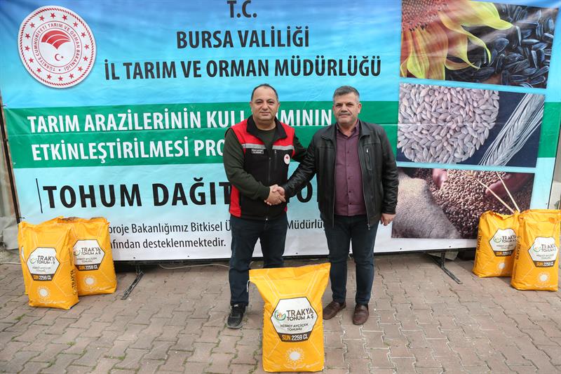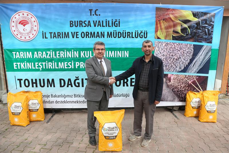 Bursa'da tarımsal üretimi güçlendirmek ve tarım arazilerini daha etkin kullanmak amacıyla önemli bir adım daha atıldı. Tarım ve Orman Bakanlığı tarafından yürütülen Tarım Arazilerinin Kullanımının Etkinleştirilmesi (TAKE) Projesi kapsamında, 268 üreticiye yüzde 75 hibe destekli toplam 236 torba yağlık ayçiçeği tohumu dağıtıldı.